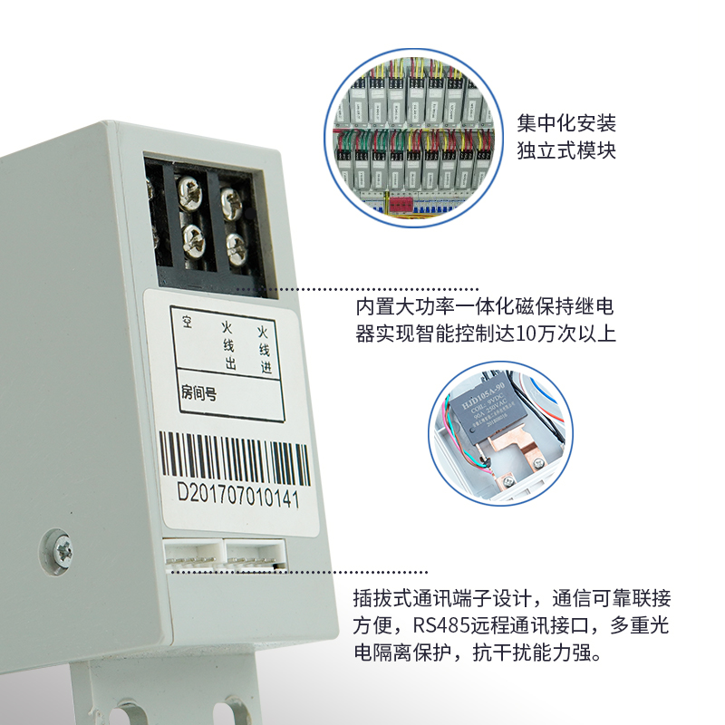 4、独立管控空调、照明、插座回路,均具有定时关电、过载跳电、分时限流、恶性跳电、温度检测、红外控制等功能。