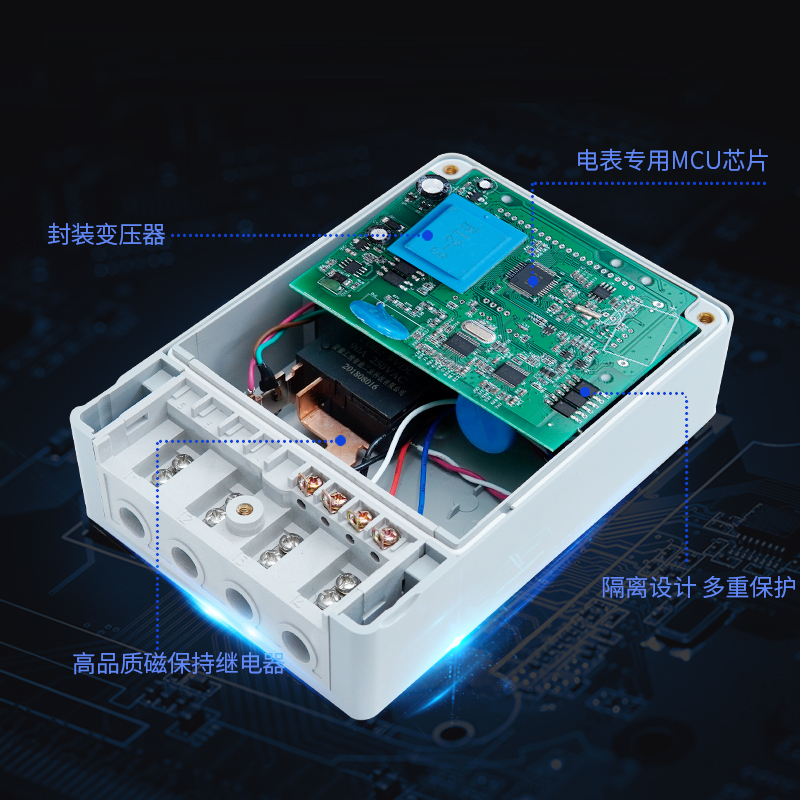 采用专用高性能MCU芯片,配套满足校园专用功能的嵌入式软件,具有光电隔离RS485通讯接口、红外通讯接口、LCD大屏幕液晶显示,内置大功率磁保持继电器实现精准计量、远程抄表、智能费控和安全识别管理。