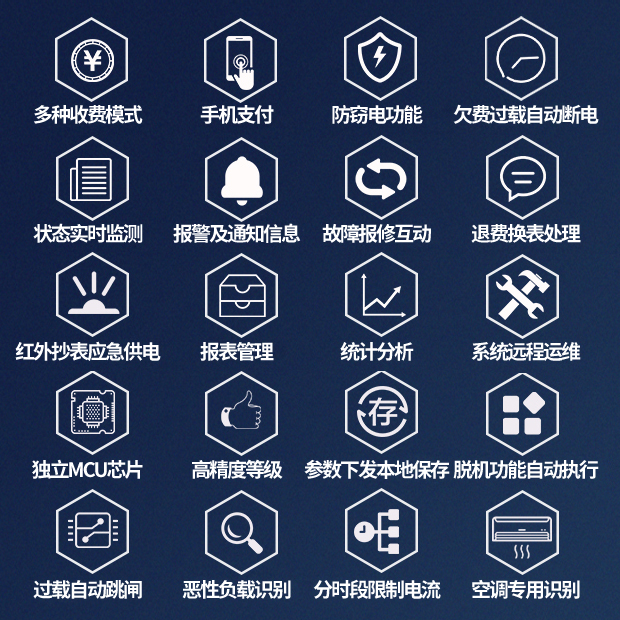 本产品主要用于新建或改造学生公寓、员工宿舍、商业综合体等,实现远程抄表,预缴电费、低量提示、欠费停电、及安全用电管理和报表统计打印,有效解决收费难题,解除安全用电隐患。